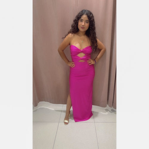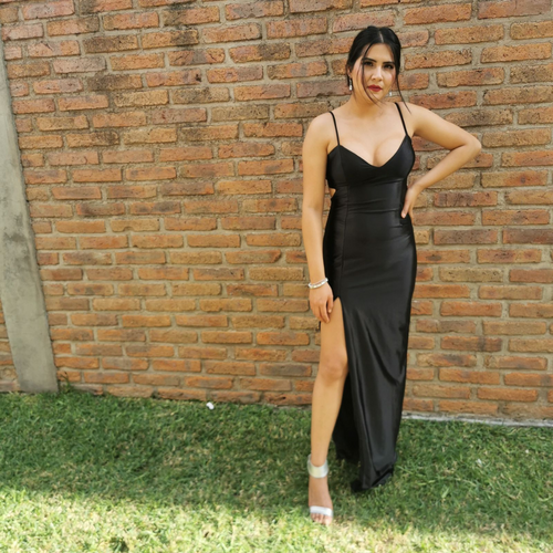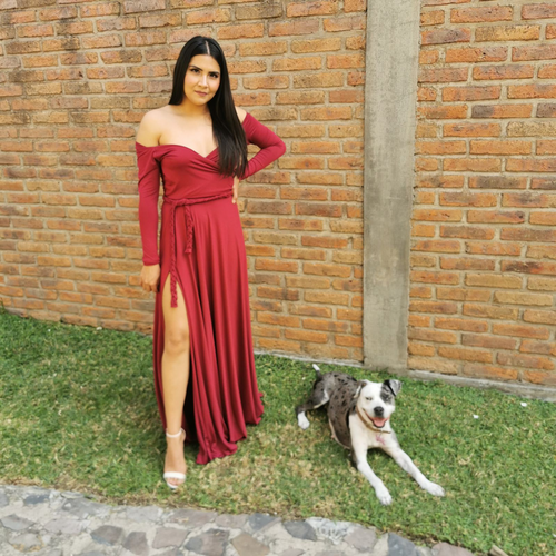 Vestido largo recto manga larga hombros descubiertos abierta en pierna